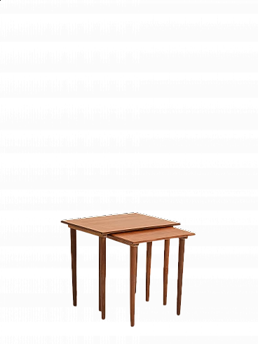 Set di 2 tavolini da salotto a incastro di provenienza scandinava. Bellissimi tavoli da divano sovrapponibili, pensati per creare volumi diversi nella stanza. I pezzi sono tutti indipendenti che possono essere separati o impilati a seconda delle esigenze. DIMENSIONI: Tavolo grande: H48cm, L52cm, P40cm Tavolo piccolo: H45cm, L48cm, P38cm Condizioni: buone condizioni, sono stati trattati con gommalacca e pure cera d’api con carnauba. Per piacere presta attenzione alle fotografie!