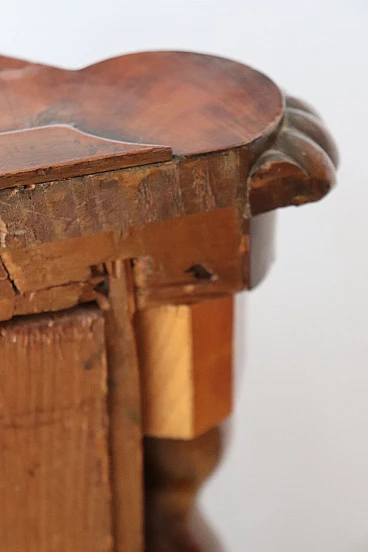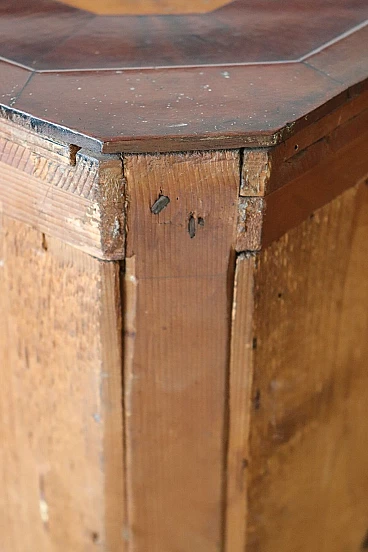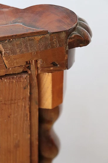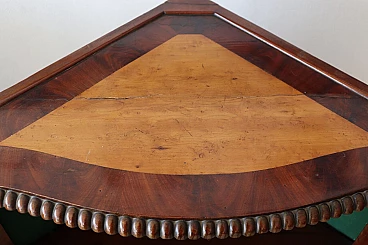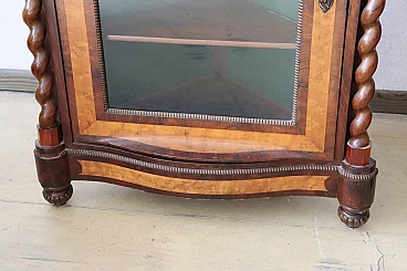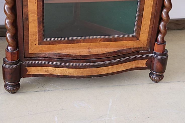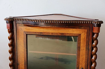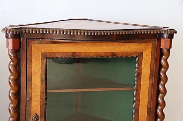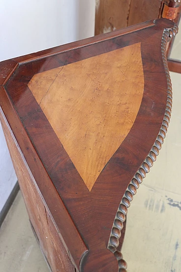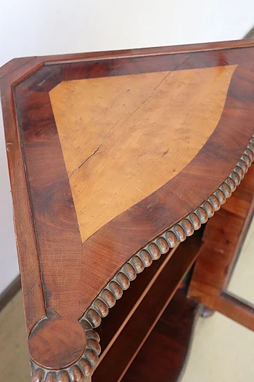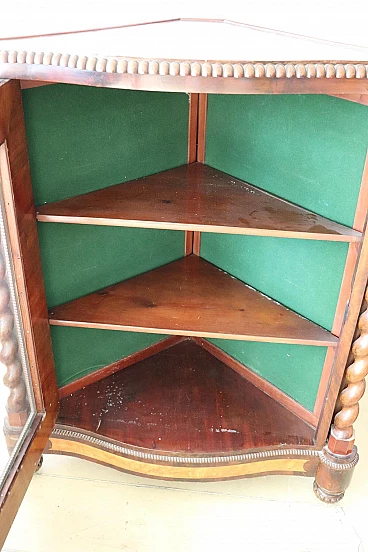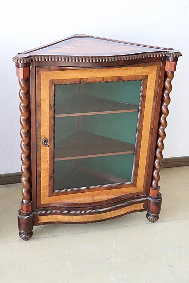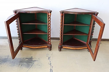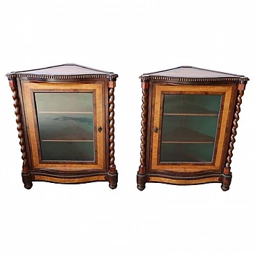 Rara coppia di angoliere piena epoca Carlo X primi ottocento in pregiato legno di mogano e radica di betulla. Internamente sono rivestite in tessuto verde. Sul davanti due eleganti colonne decorative tornite. Molto particolare la combinazione del colore dei due diversi legni, mogano e betulla. Mobili di alta ebanisteria. Particolare forma arrotondata sul davanti. Le porte in vetro ti consentono di lasciare a vista i tuoi preziosi servizi. Al retro presente chiodatura antica d'epoca. Usate buone condizioni generali.