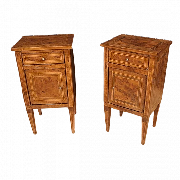 Coppia di comodini italiani della metà del XX secolo. Mobili intarsiati in stile Luigi XVI in legni di noce, radica, acero e mogano di bella linea e piacevole arredamento. Comodini lui/lei di misure leggermente differenti (misure comodino piccolo H 75 x L 40 x P 33 cm). Mobili rivestiti internamente con carta che presenta qualche segno di usura (vedi foto). Comodini ideali da inserire in una camera o salotto, per antiquari e arredatori. Mobili sorretti da solide gambe intarsiate a tronco di piramide rovesciata. Strutturalmente sani, il comodino a destra presenta una piccolo graffio sull'anta (vedi foto). Nel complesso in buono stato conservativo con qualche segno del tempo.