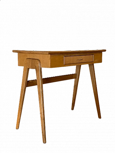 Tavolino scrittoio anni 50, struttura e gambe in legno di frassino, frontalino del cassetto in acero e interno in mogano, maniglia in ottone...... Il tavolino è stato restaurato ma, si è scelto di tenere il piano in formica originale che presenta l usura del tempo con qualche alone e graffio. Questo scrittoio fa parte di un lotto di 10 scrittoi provenienti da un hotel, ne sono al momento disponibili altri 9, stesse misure e modello ma di legni differenti