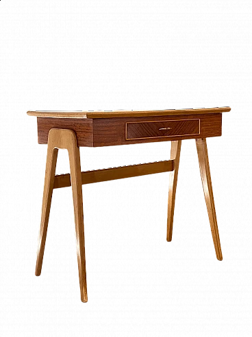 Tavolino scrittoio anni 50, struttura in legno di mogano e gambe in legno di acero, frontalino e interno del cassetto in mogano, maniglia in ottone......Il tavolino è stato restaurato ma, si è scelto di tenere il piano in formica originale che presenta l usura del tempo con qualche alone e graffio. Questo scrittoio fa parte di un lotto di 10 scrittoi provenienti da un hotel, ne sono al momento disponibili altri 9, stesse misure e modello ma di legni differenti.