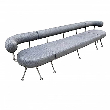 Grande divano anni '80 composto da un elemento centrale dritto e due elementi terminali tondi con schienale curvo. Ogni parte tappezzata è sfoderabile. Piedi regolabili e reggischienale in alluminio pressofuso.