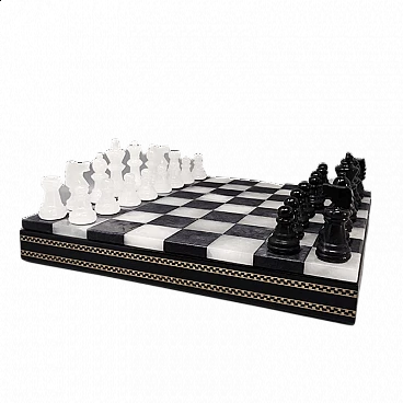 Scacchi bianchi e neri in alabastro di Volterra con scatola in legno laccato, anni '60