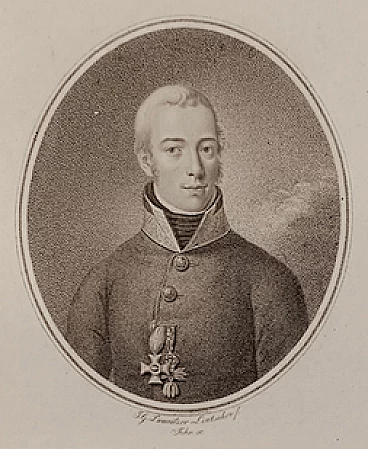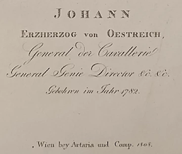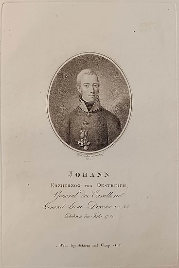 Acquaforte a puntinato. In questa stampa viene rappresentata, entro un ovale, la figura a mezzo busto di Giovanni d’Asburgo, arciduca d’Austria (Firenze 1782 – Graz 1859) tredicesimo figlio dell’allora granduca Leopoldo di Toscana e della principessa Maria Luisa di Spagna. È colto frontalmente con il volto rivolto leggermente a destra, indossa la divisa militare e sul petto, al centro, sono ben visibili le due onorificenze, quella dell’Ordine del Vello d’Oro e quella dell’ordine di Maria Teresa. La tecnica a puntinato crea dei passaggi chiaroscurali delicati che mostrano tutti i dettagli della figura, ne esaltano i volumi e donano all’espressione fiera serenità e nobile eleganza. La stampa è datata 1808, dunque il futuro Arciduca ha 26 anni. Oltre l’immagine in basso incisi i nomi dell’inventore del soggetto: Johan Georg Lumnitzer; quello dell’incisore polacco: Friedrich John; il titolo e l’indicazione dell’editore: Wien bei Artaria e Camp 1808.