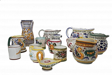 Collezione majoliche completamente artigianali di Deruta, Umbria. Componenti vendibili anche singolarmente. Leggera usura dovuta all’età e all’utilizzo, un modello è senza chiave. Presente un marchio di attribuzione.