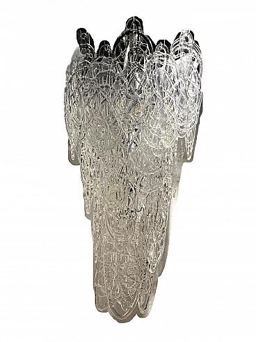 Grande lampadario in vetro anni '60 di Vistosi per Mazzega. Modello noto come “spun-sugar” per la lavorazione del vetro che ricorda lo zucchero caramellato. Il lampadario si compone di una struttura di metallo a lampadario con dei ganci alla cui estremità viene apposto il singolo pezzo di vetro. Disponibili 2 pezzi. Prezzo indicato cada uno