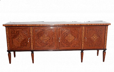 Credenza stile Luigi XVI. Epoca 1950-60. Credenza in stile antico L.XVI costruita da maestri ebanisti lombardi nel 1950/60. La credenza porta quattro ante con ripiani all’interno, chiavi e serrature funzionanti. Piedini troncopiramidali. Impiallacciata in varie essenze pregiate: mogano, boise de rose, filettature in legno chiaro e altri legni. Vernice originale con piccoli segni del tempo, ravvivata recentemente.