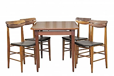 Set da pranzo in stile scandinavo degli anni sessanta in legno di teak. Quattro sedie con seduta in skai nero e tavolo allungabile. Ideale fino a 8 persone (Misure tavolo aperto: 171 cm). Misure sedie (cm): altezza 87; larghezza 44; profondità 46; altezza sedute:50 Legno pulito e lucidato. In ottime condizioni con qualche piccolissimo segno del tempo.
