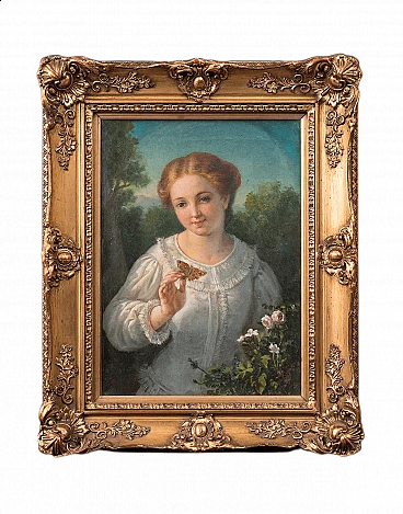 Dipinto antico olio su tela raffigurante donna immersa tra la natura con una farfalla in mano. L'atteggiamento della donna unitamente alla finezza della pittura fanno pensare alla scuola di Gioacchino Toma. Provenienza: Napoli XIX secolo. Condizioni Generali: Ottimo Stato. Documento: Certificato di Autenticità. Siamo a vostra disposizione per ulteriori chiarimenti o particolari fotografici.