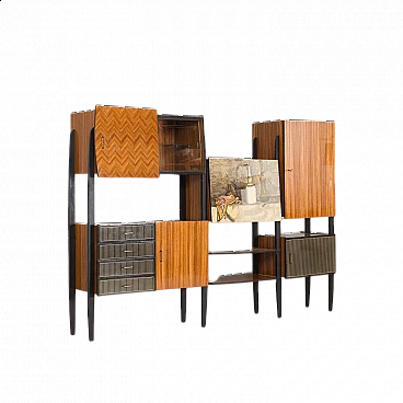 Classico pezzo italiano della metà del secolo con finitura laccata lucida, è veramente raro trovare un mobile bar dipinto a mano. È stato progettato alla maniera di Fornasetti negli anni 50. A prima vista, ricorda i pensili Vittori Dassi dello stesso periodo. Questo pensile è fatto di impiallacciatura di noce laccato, in parte dipinto, e ha dettagli in ottone. I montanti sono in faggio verniciato nero e molto ben sagomati. Ci sono molte opzioni di stoccaggio in questo mobile, ma anche alcune belle aree aperte per esporre vasi e soprammobili. Il pezzo ha piccoli difetti, e ci sono alcuni piccoli graffi, ma è completamente funzionale, e bisogna considerare che ha più di 60 anni ed è ancora in ottime condizioni.