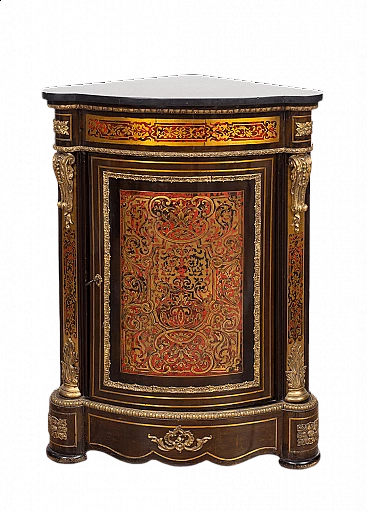 Angoliera Napoleone III Francese in legni esotici pregiati con applicazioni in bronzo dorato. Il fronte è caratterizzato da una grande anta riccamente intarsiata contornata da un profilo in bronzo dorato finemente cesellato. Il piano è in marmo nero del Belgio. Provenienza: Francia XIX secolo. Condizioni: Ottimo stato. Documento: Certificato di Autenticità. Assistenza: Siamo a vostra disposizione per ulteriori chiarimenti o particolari fotografici. Spedizione: In tutta Italia Europa e Resto del Mondo a prezzi molto contenuti in massima sicurezza e tracciabile. La spedizione sarà concordata privatamente e non sarà di costo elevato.