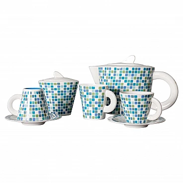 Servizio da tè Tete à Tete in ceramica disegnato da Gio Ponti per la manifattura italiana Pozzi-Ginori alla fine degli anni '70. Il set consiste in una teiera, una zuccheriera, una lattiera e due tazze con piattini di porcellana. Presenta la palette di colori tipica di Gio Ponti per le sue ceramiche di design. I suoi quadrati blu e verdi evocano il design dell' hotel Parco dei Principi di Sorrento dove il tema della ceramica è presente in ogni stanza. Sotto ogni elemento c'è la firma di Ponti.