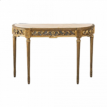 Consolle o toeletta anni ’50. Struttura in legno foglia oro. Base superiore in marmo. Buone condizione, presenta segni del tempo. Design anni ’50.