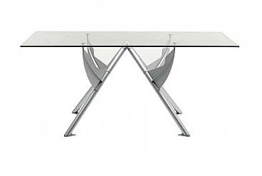 Tavolo quadrato modello President M del 1984 di Philippe Starck per Balestri Italia con struttura smontabile con quattro gambe in tubo di acciaio e fusione di alluminio satinato. Piano quadrato in vetro temperato trasparente 10 mm.