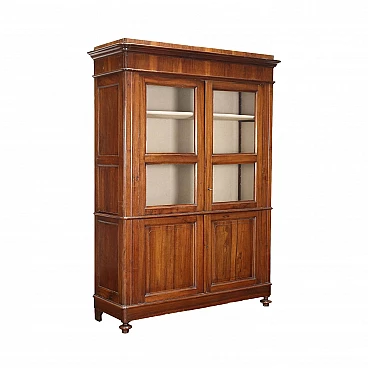 Vetrina umbertina sorretta da piedini dei quali quelli anteriori torniti, sul fronte presenta due ante pannellate nella parte inferiore e altrettante in quella superiore, dotate di vetri. In noce.