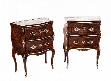 Coppia di comodini siciliani in legno esotico pregiato del XX secolo. I mobili si presentano con un andamento mosso e bombato in legni elegantemente intarsiati. Il prospetto frontale è caratterizzato da due cassetti di buona capacità e servizio, completi di due chiavi funzionanti, adornati da maniglie, bocchette e decori in bronzo dorato. Il piano è in marmo verde Calabria ad incasso con cornice lignea messa di traverso. Condizioni: Restaurati dai nostri maestri artigiani con metodo tradizionale gommalacca e alcool fatto a mano. Provenienza: Sicilia (1910/20). Documento: Certificato di Autenticità. Assistenza: Siamo a vostra disposizione per ulteriori chiarimenti o particolari fotografici. Spedizione: In tutta Italia Europa e Resto del Mondo a prezzi molto contenuti in massima sicurezza e tracciabile. La spedizione sarà concordata privatamente e non sarà di costo elevato.