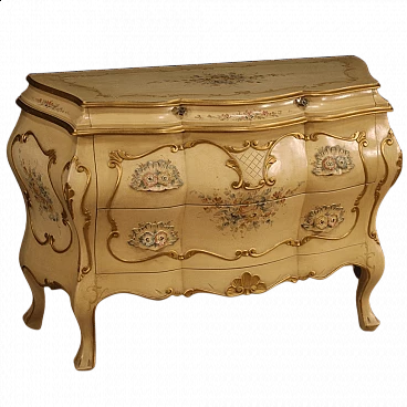 Comò veneziano del XX secolo. Mobile in legno scolpito, laccato, dorato e dipinto a mano con decori floreali di grande piacevolezza. Comò mosso e bombato munito di due cassetti più piccoli paralleli posti sotto il piano e due cassetti più grandi e capienti nella parte inferiore (vedi foto). Piano superiore ligneo in carattere anch'esso laccato e dipinto, di buona misura e servizio. Adornato da decori in rilievo su fronte e fianchi, mobile ideale da inserire in una camera o salotto. In buone condizioni.