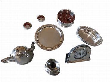 Il set è composto dai seguenti oggetti: 1 contenitore ovale portaconfetti/cioccolatini in argento € 60,00, 1 coppia di portatovaglioli in argento € 80,00, 1 portabottiglia da tavolo in argento e legno € 90,00, 1 piattino rotondo diam. 18 cm. in argento € 80,00, 1 orologio da tavolo in argento € 100,00, 1 candelabro in sheffield € 40,00, 1 caffettiera piccola in sheffield € 50,00. Il set è vendibile anche singolarmente e in caso di acquisto di più oggetti, si applica uno sconto.