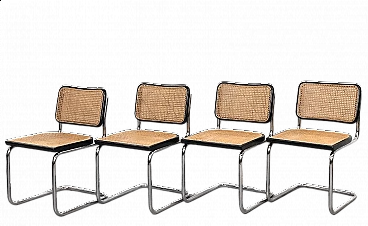 Set di 4 sedie CESCA Anni 70 Design MARCEL BREUER di produzione Italiana. La sedia Cesca è realizzata con la seduta a sbalzo opera del genio artistico dell'omonimo designer, struttura in acciaio tubolare cromato con terminali saldati, seduta e schienale con telaio e cornice in legno di faggio con finitura nera, copertura in paglia di Vienna completamente restaurata a nuovo. CONDIZIONI PERFETTE Misure :Altezza cm 80-Profondità cm 53-Larghezza cm 46-Altezza seduta cm 46-Seduta cm 46 x 42