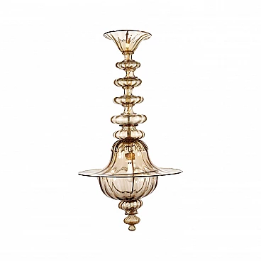 Lampadario Murano dalla forma insolita ad unico corpo centrale, su di un vetro a vassoio sono collocate diverse sfere schiacciate sovrapposte in vetro soffiato.