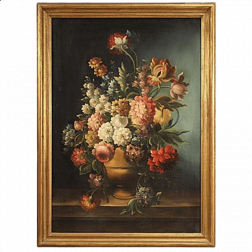 Dipinto italiano della seconda metà del XX secolo. Opera olio su tela, in prima tela, raffigurante ricca natura morta Vaso con fiori in stile antico di buona mano pittorica. Dipinto di bella misura e piacevole arredamento adornato da cornice lignea scolpita e dorata. Opera ideale da inserire in un salone o studio, per antiquari e arredatori, di piacevole decorazione. In buone condizioni. Luce dipinto H 99 x L 68 cm.
