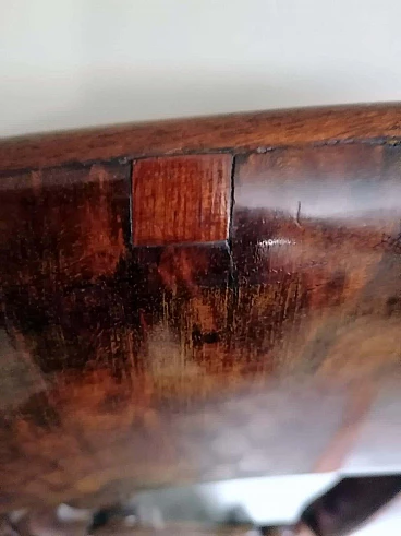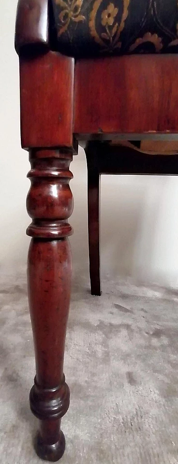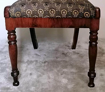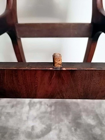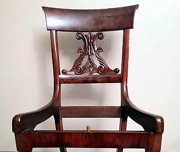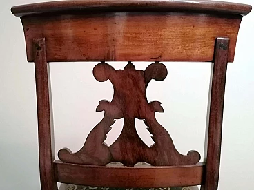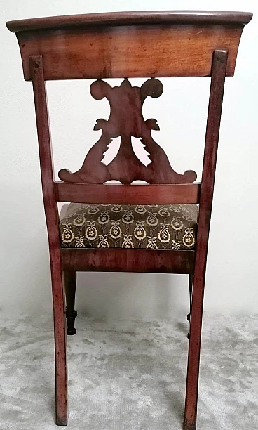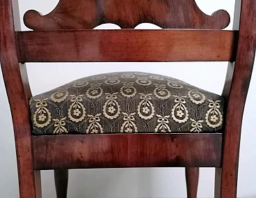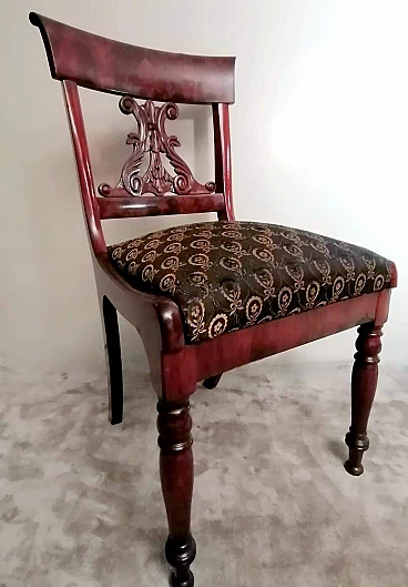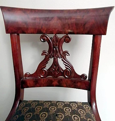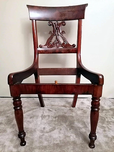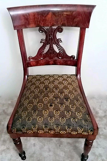Particolare ed elegante sedia dalla struttura solida e funzionale; la parte più interessante della sedia è l'elaborato e fantasioso schienale dal design armonioso e raffinato; al centro vi è una preziosa lavorazione del legno, intagliata con maestria e abilità da un maestro ebanista; le gambe anteriori sono state meticolosamente tornite per dare loro una forma leggera e proporzionata, mentre quelle posteriori hanno una sezione quadrata leggermente curvata; il piano di seduta è smontabile e un perno in legno sulla traversa anteriore permette al piano stesso di inserirsi perfettamente nel suo alloggiamento naturale. Il rivestimento della seduta è stato sostituito in tempi antichi ed è in buone condizioni (un po' di usura sul davanti, vedi foto) quindi non abbiamo ritenuto di fare alcun restauro su tutta la sedia perché il suo aspetto autentico e le leggere imperfezioni la rendono davvero seducente e affascinante e attestano la sua antichità. La sedia è stata realizzata a mano in Danimarca in perfetto stile Biedermeier utilizzando legno di mogano africano piumato tra il 1850 e il 1855 durante il regno di Federico VII. Lo stile Biedermeier diffuso soprattutto in Austria e Germania tra il 1820 e il 1850 caratterizza i mobili e gli arredi che diventano più semplici in risposta alla maestosità tipica dello stile Impero. Lo stile Biedermeier, nato dopo il Congresso di Vienna e il declino dell'Impero napoleonico, è destinato in particolare alla borghesia, che desiderava mobili semplici e funzionali. Lo scopo del movimento artistico Biedermeier è quello di esaltare la sobrietà e l'armonia, modificando alcuni dei motivi stilistici del periodo precedente, ma spogliandoli di tutte le decorazioni, fronzoli ed eccessi che lo avevano caratterizzato. In questa sedia, sobria e armoniosa viene sapientemente sottolineato l'accostamento di linee curve e rette in un interessante gioco di volumi e geometrie, conferendo all'oggetto un'eleganza senza tempo che può caratterizzare qualsiasi ambiente della casa. Misure larghezza cm.48, profondità cm.48, altezza cm.88, seduta cm.48.