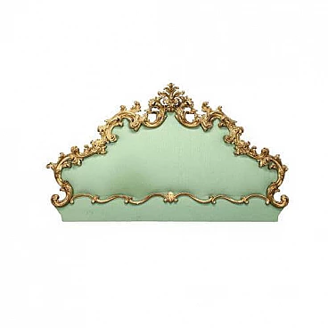 Testata letto in stile Barocco con decorazione perimetrale e cimasa in legno intagliato e dorato. Imbottita.