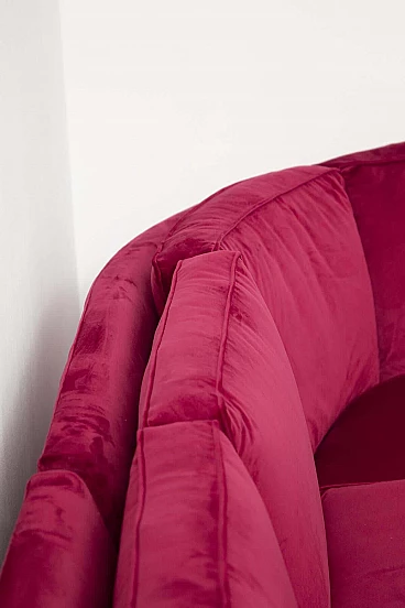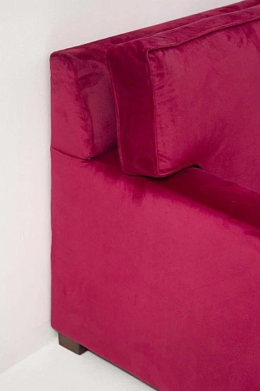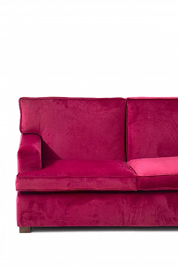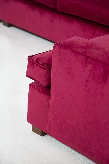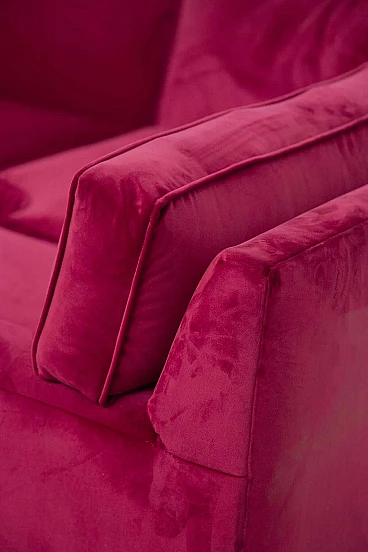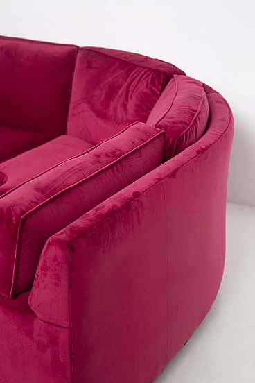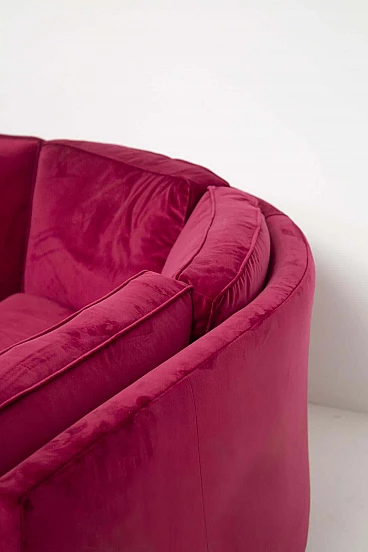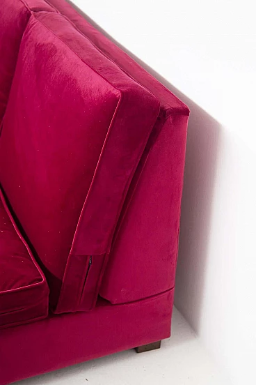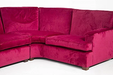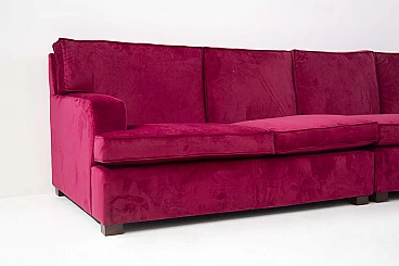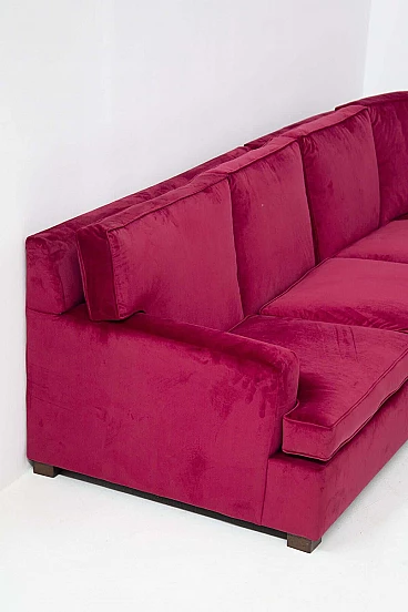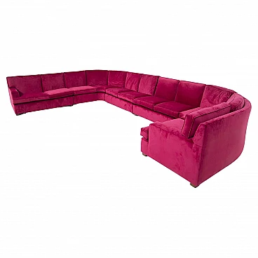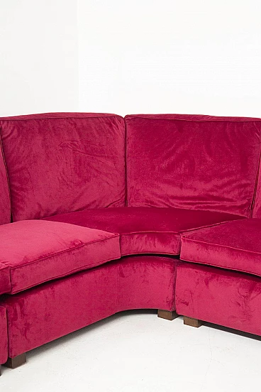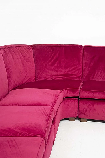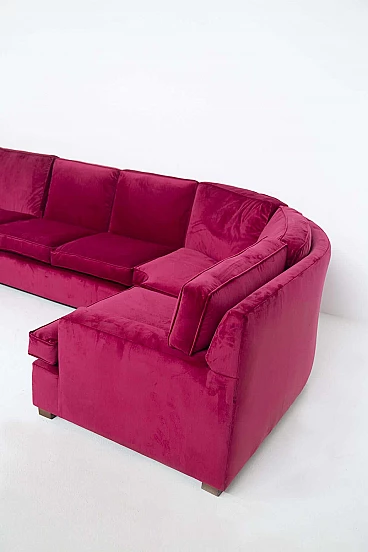 Divano da salotto degli anni '60 attribuito all' architetto Luigi Caccia Dominioni. Il divano proviene da una casa totalmente realizzata dall'architetto Luigi Caccia Dominioni, tutti i mobili erano fatti su misura. Il divano è stato recentemente restaurato e rinfrescato in velluto fucsia scuro, l'elegante tessuto conferisce al divano raffinatezza e grazia. Linee pulite e nitide sono le caratteristiche di questo costoso mobile. Il divano attraverso i suoi 12 posti forma una forma a ferro di cavallo, i suoi angoli sono morbidamente arrotondati. I suoi piedi sono in legno con una forma quadrata. Dimensioni della curva destra 178 cm, curva sinistra 100 cm di profondità.