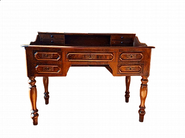 Antico scrittoio di fine '800 retto da quattro gambe tornite. Nella parte inferiore presenta cinque cassetti (di cui quattro piccoli ai lati e uno grande al centro) foderati internamente in stoffa colore bordeaux. Sull' alzata ci sono quattro cassettini internamente foderati in stoffa colore bordeaux. Il piano di lavoro presenta un inserto in pelle. Il mobile è perfettamente restaurato e non necessita di ulteriori interventi.