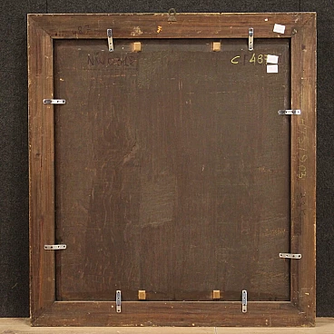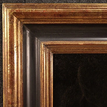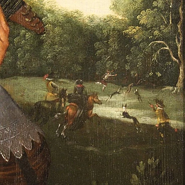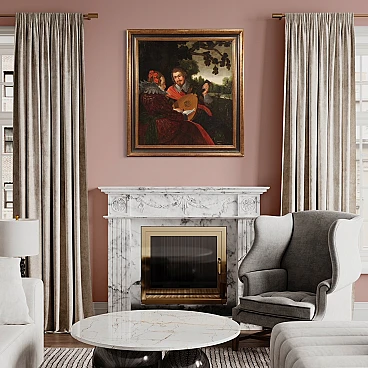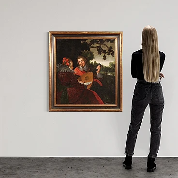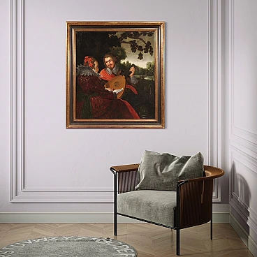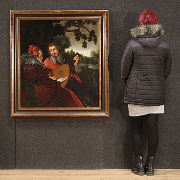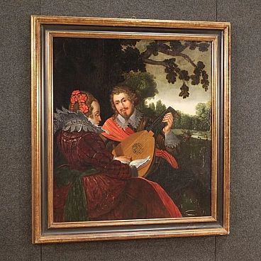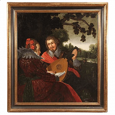 Antico dipinto fiammingo della seconda metà del XVII secolo. Opera olio su tavola in rovere raffigurante Musici, elegante duetto con suonatore di liuto e scena di caccia sullo sfondo. Da notare la raffinatezza delle vesti e i minuziosi dettagli tipici dello stile fiammingo. Cornice lignea moderna scolpita, laccata e dorata (tinta bronzo) di piacevole decorazione. Scena galante in paesaggio campestre di grande piacevolezza, per antiquari, arredatori e collezionisti di pittura fiamminga antica. Opera che ha subito un intervento di restauro conservativo, pulitura e ripresa del colore in alcuni punti (vedi foto). In buone condizioni. Luce dipinto H 91 x L 81 cm.