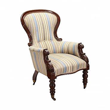 Poltrona Luigi Filippo, sorretta da gambe dotate di rotelle; montanti dei braccioli e schienale intagliati con caratteristiche volute fogliacee. In mogano, la seduta e lo schienale sono imbottiti.