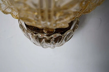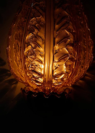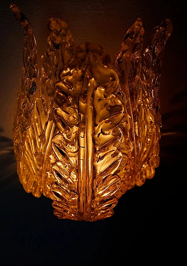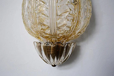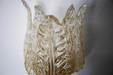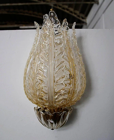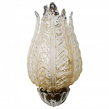 Lampada da parete Venini in vetro di Murano del 1930 caratterizzata da una miscela di graniglia di vetro di colore trasparente con un "cordone" nel bordo superiore d'oro. Composta da tre foglie, disposte parallelamente tra loro a formare un piccolo ventaglio. Nella parte inferiore è presente un elemento in vetro a forma di ciotola di fiore che assembla, grazie ai suoi innesti in ottone, l'intera lampada. La lampada da parete è interamente realizzata a mano dai maestri veneziani. La lampada ha solo 1 luce, funzionante.
