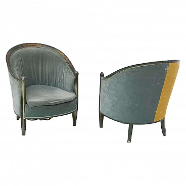 Coppia di poltrone francesi dei primi anni del 1900 nella loro condizione originale, non hanno mai subito restauri, sono ricoperte di velluto originale dell'epoca in verde oliva e giallo nella parte posteriore. La struttura delle poltrone è in robusto legno laccato e dipinto con particolari decorazioni a cineserie dorate.