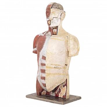 Torso anatomico prodotto negli anni '60 da Produzione Scientifica Paravia, nota per i suoi accurati modelli di anatomia. Questo modello anatomico è stato creato migliorando i metodi di fabbricazione della carta iniziati nel 1891 circa. Questi metodi hanno portato a modelli resistenti all'aria secca e all'umidità. Modello anatomico del 1960 su lastra di legno: l'esterno della figura mostra una metà scomposta del torso che rivela la struttura muscolare del corpo;, il petto e l'addome sono costituiti da una sezione rimovibile che è attaccata da clip metalliche al corpo principale, la rimozione della lastra rivela gli organi interni che non sono presenti. L'interno e l'esterno della figura sono dipinti e laccati per rappresentare ulteriormente un torso umano e la sua struttura anatomica, la figura è sostenuta su una base costruita da un legno scuro a grana stretta. La figura è fatta di pasta fibrosa che riveste una struttura di filo e legno. Strati di fibra sono applicati alla pasta per creare un substrato su cui è applicato uno sfondo bianco (gesso), questo sfondo fornisce la base su cui sono applicate arterie e vene fatte di filo. Sia l'interno che l'esterno della figura sono laccati: i molti colori utilizzati comprendono i rossi e i blu (che rappresentano le zone ossigenate o impoverite di ossigeno) così come le ocre, i marroni e i verdi. Questo antico modello di torso anatomico dipinto a mano è stato usato per insegnare la classe. È fatto di cartapesta e gesso su legno ed è un modello grande. Ha anche un supporto sul retro ma è bello da usare come decorazione murale. Tracce di età e uso, qualche perdita di vernice.