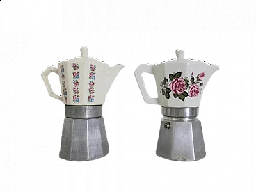 Caffettiere Bialetti in alluminio con bricco in porcellana, decorazione floreale, anni '60. Questo oggetto ha un marchio di attribuzione. Leggera usura dovuta all’età e all’utilizzo. Alluminio, porcellana.