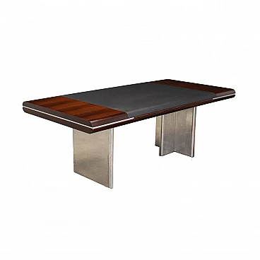 Scrivania direzionale anni 70 con supporti rivestiti di acciaio inox, piano impiallacciato in noce bordato in massello, pannello centrale rivestito in pelle.