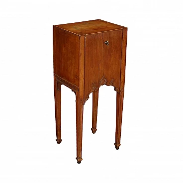 Comodino neoclassico genovese in ciliegio con anta a ribalta sottopiano e decorazione a motivo rocaille intagliato sul massello. Gambe troncopiramidali.