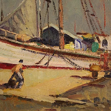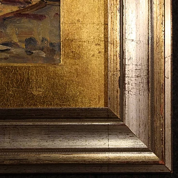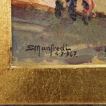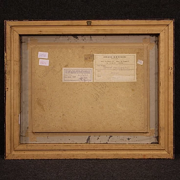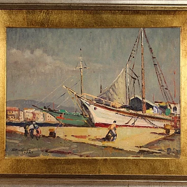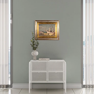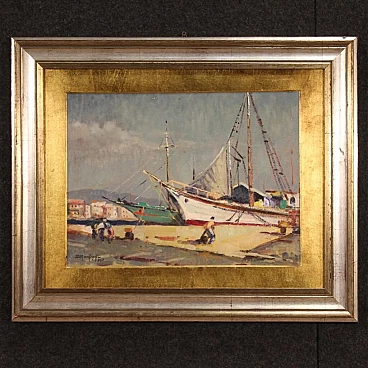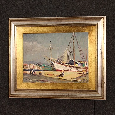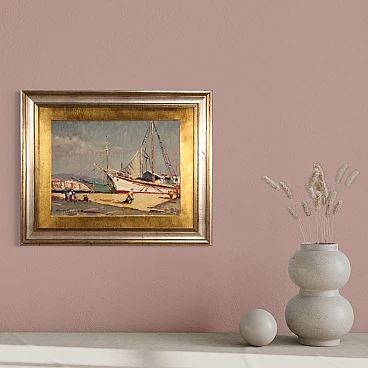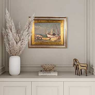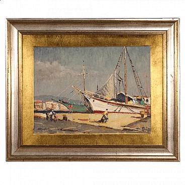 Dipinto italiano datato 4 Luglio 1967. Opera olio su tavoletta raffigurante paesaggio marino con vecchi pescherecci all'ancora di buona mano pittorica. Cornice lignea scolpita, argentata e dorata di bella decorazione. Quadro di misura contenuta, per antiquari, arredatori e collezionisti di pittura italiana del XX secolo. Opera firmata e datata in basso a sinistra 4-7-1967 S. Manfredi (vedi foto) riferibile al pittore Sergio Manfredi (1932-?) mancante di autentica. Dipinto di buona luminosità, in buone condizioni, con qualche piccolo segno del tempo. Luce dipinto H 29 x L 39 cm.