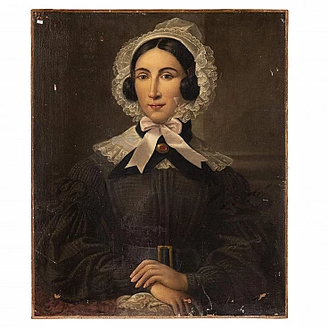 Dipinto antico italiano olio su tela 1840 circa. Ritratto di una giovane fanciulla. La ragazza è vestita con abiti dell' Ottocento: un abito da giorno molto sobrio ma che rivela una posizione aristocratica nella società. Alta qualità artistica da notare la precisione nei dettagli. Bellissima la cuffia ricamata in pizzo un accessorio molto di moda in quegli anni. Il fiocco in raso è realizzato con gran precisione. Il volto è sereno e le mani curate evidenziano una grande attenzione per l'aspetto fisico. Dipinto venduto senza cornice. La tela è stata rifoderata. Vi consigliamo di guardare bene in dettaglio tutte le foto allegate. MISURE IN CM senza cornice 74 x 62
