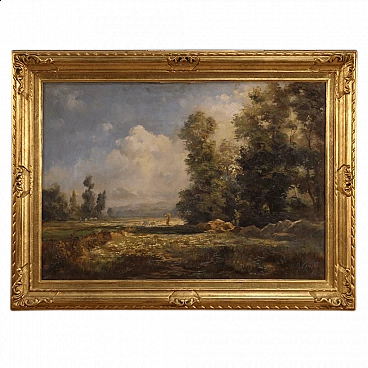 Dipinto italiano della metà del XX secolo. Opera olio su tela raffigurante paesaggio in stile impressionista: veduta campestre con pastore e animali di buona mano pittorica. Cornice in legno e gesso piacevolmente scolpita e dorata di bella decorazione. Dipinto firmato in basso a destra N. Grechi (vedi foto) riferibile al pittore Omobono “Nino” Grechi (1900-1975), mancante di autentica. Opera di favoloso arredamento e grande luminosità, per antiquari e arredatori. In buone condizioni. Luce dipinto H 68,5 x L 98 cm.