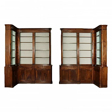 Coppia di grandi librerie angolari in noce con interni in abete, presentano quattro ante alternate da montanti a lesena sui lati lunghi e due ante su quello corto. Una fila di cassettini sono posti nella fascia del sottopiano. Oggetto mancante di serrature. Munite di certificato di autenticità.