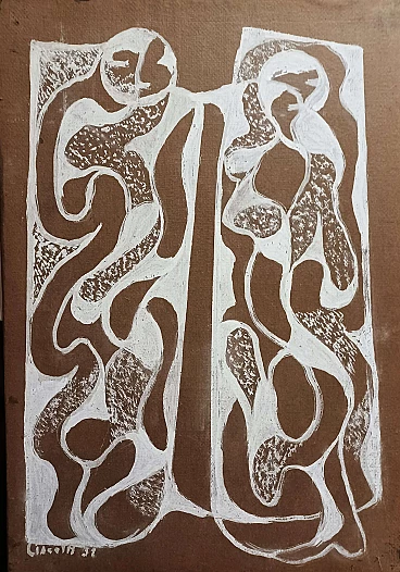 Tempera su carta applicata su tela, cm 50 x 35, firma e data sul fronte in basso a sinistra, etichetta apposta sul retro. Disponibile documentazione. Opera storica in perfetto stato di conservazione. Siamo a disposizione per qualsiasi informazione e dettagli.