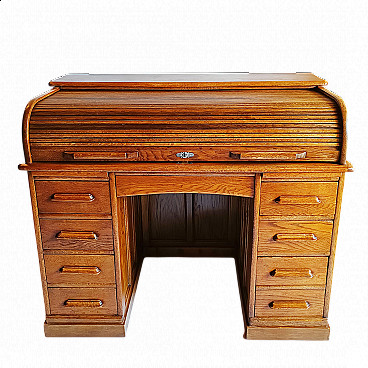 Scrivania a rullo a 9 cassetti in rovere, del '900