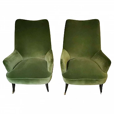 Coppia di poltrone imbottite molto comode; la struttura è molto solida con gambe in ottone verniciato nero; i braccioli sono curvati verso l'esterno per dare più spazio e comodità alla seduta, che è ampia e confortevole; lo schienale è ampio, alto e avvolgente; le gambe, elegantemente sagomate, sono parte integrante e importante dell'intero disegno; la protezione in ottone all'estremità delle due gambe anteriori è molto graziosa e particolare; le passamanerie che decorano i lati delle poltrone sono molto eleganti, pregiate e raffinate; l'aspetto generale è curvilineo con linee morbide, perfetto per trasmettere una sensazione di comfort e benessere. Le poltrone sono state realizzate tra il 1950 e il 1954 da maestri artigiani milanesi che hanno lavorato in collaborazione con il designer Gugliemo Ulrich sui suoi importanti progetti. Guglielmo Ulrich è nato a Milano nel 1904 da Alberto e Luisa Battaglia. Di nobile famiglia di origine danese, frequenta l'Accademia di Brera e, dopo due anni, nel 1928 si laurea in architettura al Politecnico di Milano. Architetto, designer, decoratore d'interni e pittore, Ulrich è stato uno dei più interessanti artisti poliedrici del secolo scorso che ha trovato senza dubbio la sua massima espressione nel mondo del design tra gli anni '40 e '70 del Novecento. Ciò che colpisce del lavoro di Ulrich è proprio la sua capacità di coniugare innovazione e nuova identità del design italiano. Una capacità unica di creare un legame tra tradizione e innovazione. La struttura in legno è stata lasciata nella sua condizione originale, mentre abbiamo rifoderato le sedie con un velluto di cotone verde eccezionalmente morbido e robusto, scegliendo un tessuto sofisticato e molto costoso di Designer Guild. Designer Guild, fondata nel 1970 da Tricia Guild, è un'azienda internazionale di arredamento e lifestyle con sede e showroom a Londra in Kings Road e Marylebone High Street e con negozi propri in tutto il mondo; inoltre disegna e distribuisce in tutto il mondo collezioni di tessuti d'arredamento di lusso ad alto impatto, carte da parati, tessuti per tappezzeria, accessori per il bagno e la camera da letto. Il lavoro di tappezzeria è stato realizzato a mano con abilità e precisione da un vecchio maestro artigiano di Prato (Italia); vogliamo ricordare che la città di Prato è considerata il più grande centro tessile del mondo, i suoi artigiani e le sue aziende, altamente specializzate, sono un punto di riferimento per creatività, qualità, ed eccellenza. Le due poltrone sono state riportate in vita con maestria e sapienza per dare a qualsiasi ambiente stile e personalità estetica, hanno assunto un fascino personale e unico, diventando un complemento d'arredo discreto e originale, capace di creare atmosfere tranquille e serene, donando romanticismo e raffinatezza, inoltre il colore verde Gilda si abbina perfettamente ad altri colori e si presta a diversi stili di case, dal tradizionale al moderno.