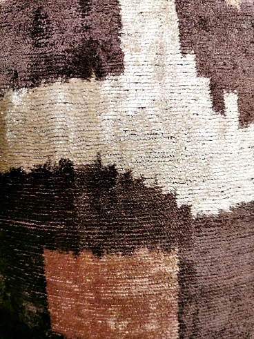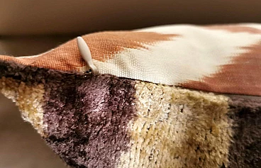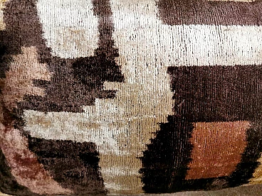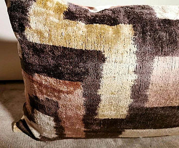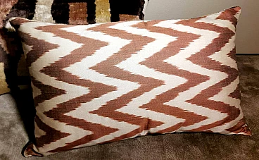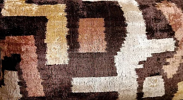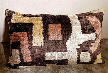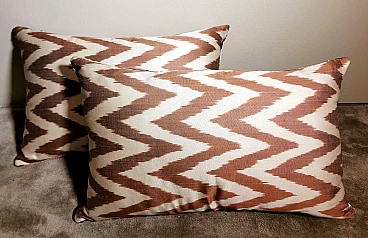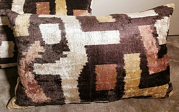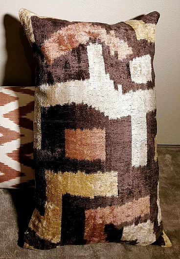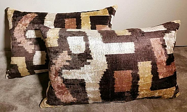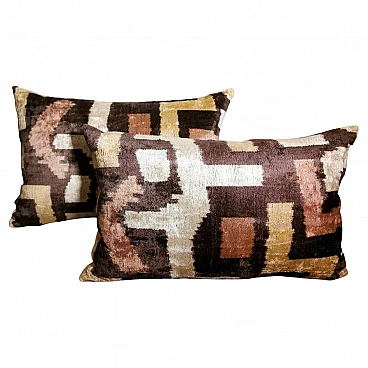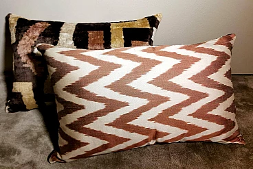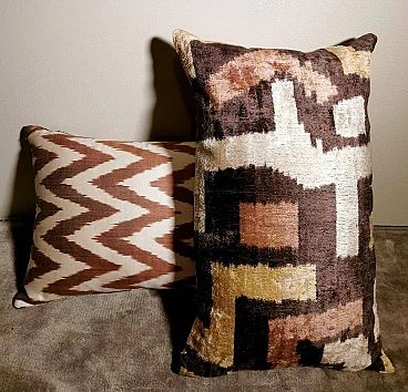 Coppia di cuscini fatti a mano in tessuto Ikat; il lato superiore è in velluto di seta con colori di tono marrone e decorazioni geometriche, il retro è in seta bianca con motivo geometrico arancione. I due cuscini sono pezzi unici e irripetibili, sono stati realizzati tra il 2005 e il 2009 in piccoli laboratori dell'Uzbekistan meridionale con il velluto di seta ikat "baghmal" spesso e morbido. L'ikat (il significato del termine in uzbeko è "nuvola"), è una tecnica di tintura dei filati, che permette di ottenere bellissimi disegni dai contorni sfumati; nata originariamente in Malesia e Indonesia, si è poi sviluppata autonomamente in molte culture e continenti diversi, come Perù e Guatemala, Giappone, Yemen, India e Uzbekistan. Il termine "ikat" è indonesiano ("mengikat") e significa annodare, legare, perché alcune parti dei filati sono protette da una stretta legatura per non essere tinte, mentre le parti non legate sono colorate. Il risultato è un filato solo parzialmente colorato, che una volta tessuto rivela un motivo decorativo animato. Il procedimento è molto dispendioso in termini di tempo, oltre che molto complesso, tanto da richiedere una notevole abilità, ed è proprio per questo che all'interno delle culture che li producevano, gli "ikat" erano tipicamente degli status symbol. L'India e l'Indonesia hanno le loro antiche tradizioni di fabbricazione di tessuti ikat, tuttavia, sono i tessuti ikat dell'Uzbekistan che sono diventati un successo recente nell'industria della moda e del design d'interni per i loro disegni grandi e audaci e per la miscelazione di colori ikat inimmaginabili. Oggi l'ikat è il tessuto nazionale dell'Uzbekistan, dove viene prodotto principalmente nella regione meridionale, nelle città di Bukhara, Samarcanda, Tashkent, Khiva, e nella città di Kokand nella valle di Ferghana; dal 1960 al 1990 fino ad oggi molte abilità e tecniche tessili tradizionali che erano state trascurate per anni sono state riportate in vita, anche grazie all'incentivo statale di non far pagare tasse agli artigiani che producono manualmente. In Uzbekistan si producevano tessuti già prima della conquista del paese da parte di Carlo Magno nel 329 a.C. e l'economia commerciale del paese è sempre stata prospera grazie ai ricchi scambi che la coinvolgevano: L'Uzbekistan passava l'affascinante, misteriosa e leggendaria "Via della Seta".