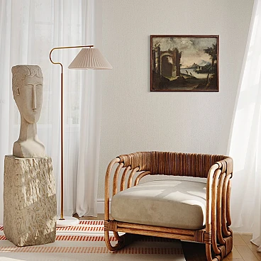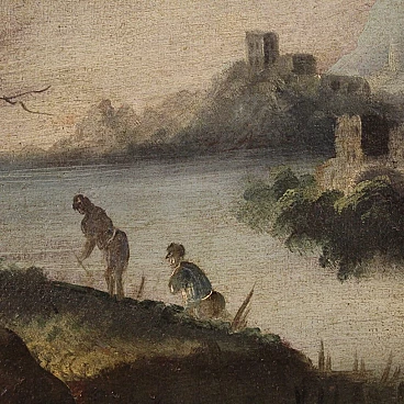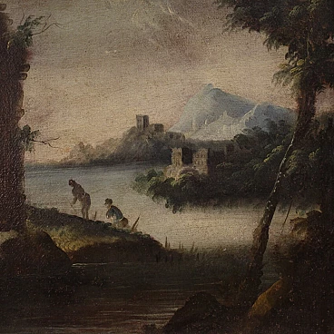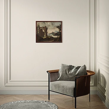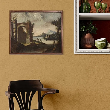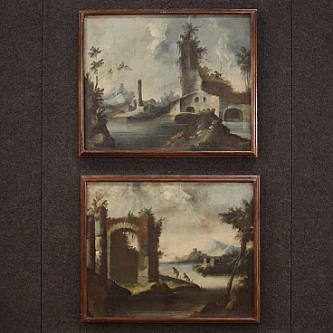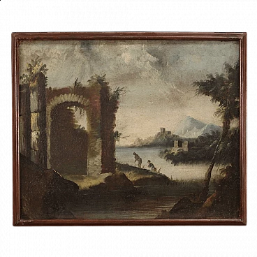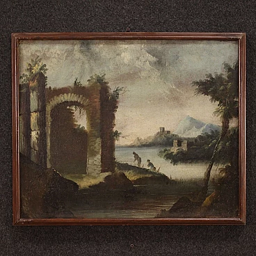 Antico dipinto italiano del XVIII secolo. Opera olio su tela raffigurante paesaggio con rovine, architetture e personaggi di buona mano pittorica. Quadro di misura contenuta, facilmente inseribile in diversi punti della casa, per antiquari e collezionisti di paesaggi antichi. Cornice lignea non coeva scolpita e dipinta di bella decorazione. Dipinto che ha subito un intervento di restauro conservativo, rintelo, sostituzione del telaio e ripresa del colore in alcuni punti (vedi foto). Opera facente parte di un pendant (vedi foto e richiedi il prezzo in blocco se disponibile). In buone condizioni con qualche segno del tempo. Luce dipinto H 48 x L 59.5 cm.