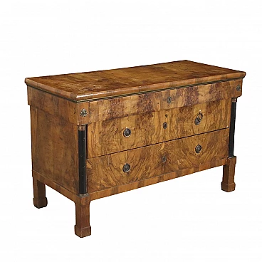 Cassettone impero veneto, sorretto da piedi a plinto, sul fronte presenta due cassetti inquadrati tra coppia ci semi-colonne ebanizzate a sostenere la fascia sottopiano lievemente aggettante, nella quale si trova un altro cassetto e termina con cornicetta ottonata. Impiallacciato in radica di noce, gli interni sono in abete.