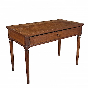 Scrittoio emiliano in noce con cassetto nella fascia centrale e gambe troncoconiche con collare tornito.