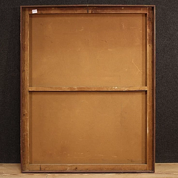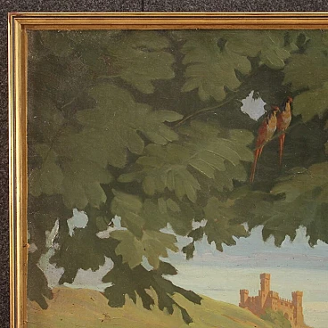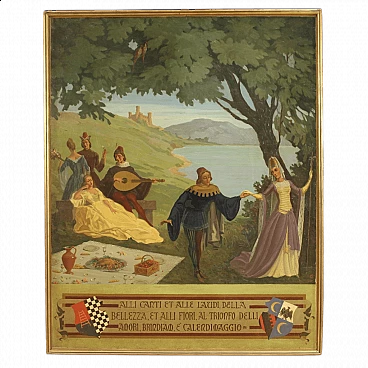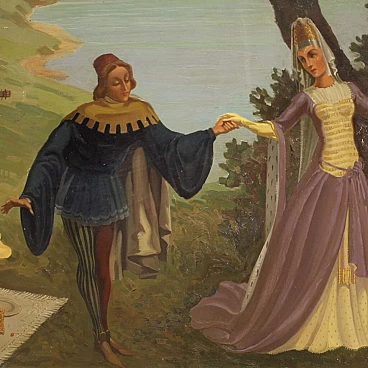 Paesaggio con personaggi rinascimentali, dipinto italiano olio su masonite, 1945