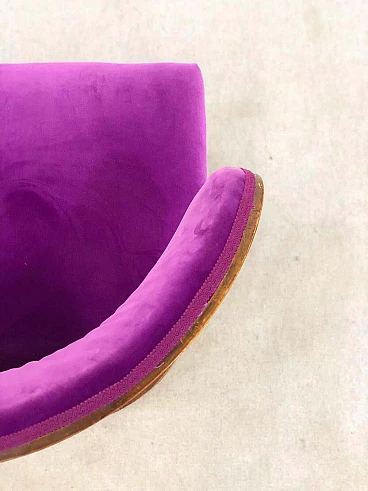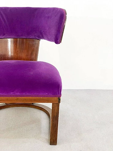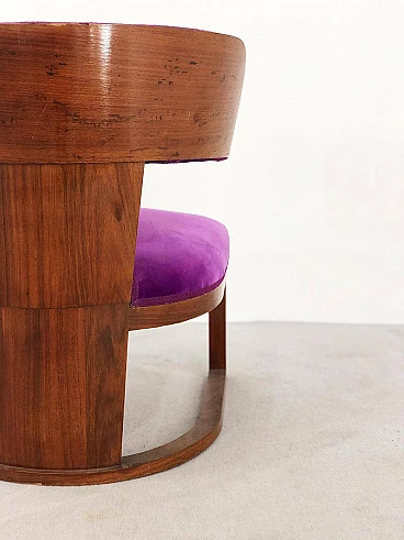 Poltrona di Ernesto Lapadula del periodo Art Deco italiano prodotta nel 1930. La poltrona può anche essere classificata del periodo razionalista italiano (una corrente architettonica che si sviluppò in Italia negli anni 1920 e 1930 in connessione con il Movimento Moderno Internazionale, seguendo i principi del funzionalismo, continuando in varie frange fino agli anni 1970). La poltrona di Ernesto Lapadula ha una struttura in legno di noce mentre il rivestimento è in velluto viola. La seduta proviene dalla casa privata Lapadula. La poltrona è attribuita al designer da Bruno Filippo Lapadula, responsabile dell'archivio Lapadula di Roma. La poltrona di Ernesto Lapdaula presenta lievi graffi nel legno perché è originale dell'epoca, mentre il tessuto della seduta e dello schienale è stato sostituito e rifoderato in fine velluto viola. Ottime condizioni generali.